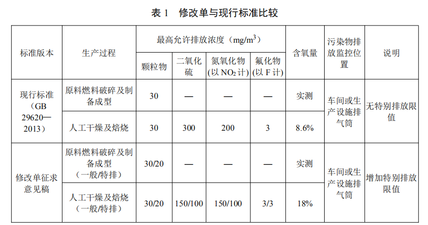 目前磚瓦行業執行GB 29620—2013,梳理標準存在的問題,對磚瓦窯煙氣 基準含氧量、重點地區特別排放限值等方面進行了修改,修改前后標準變化情 況見表1。