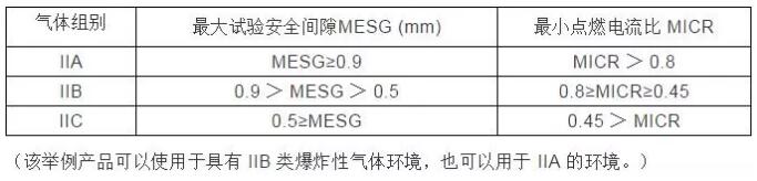 爆炸性氣體混合物的傳爆能力,標志著其爆炸危險程度的高低,爆炸性混合物的傳爆能力越大,其危險性越高。爆炸性混合物的傳爆能力可用最大試驗安全間隙表示。同時,爆炸性氣體、液體蒸汽、薄霧被點燃的難易程度也標志著其爆炸危險程度的高低,它用最小點燃電流比表示。II類隔爆型電氣設(shè)備或本質(zhì)安全型電氣設(shè)備,按其適用于爆炸性氣體混合物的最大試驗安全間隙或最小點燃電流比,進一步分為IIA、IIB和IIC類。如下表所示。