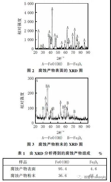 分別對熱管換熱器爐管外側(cè)的翅片腐蝕產(chǎn)物表面和腐蝕產(chǎn)物粉末進(jìn)行了XRD 檢測,結(jié)果分別見圖2和圖3,由XRD 分析得到的腐蝕產(chǎn)物組成見表1。從表1 可知,腐蝕產(chǎn)物表面主要成分為FeO(OH),而腐蝕產(chǎn)物粉末主要成分為Fe2O3 和FeO(OH)。
