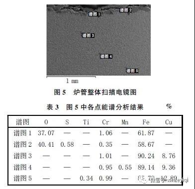 對腐蝕較輕的爐管進(jìn)行了掃描電鏡及能譜分析,結(jié)果見圖5 和表3。由圖5 可知,爐管表面存在腐蝕層,平均在0.2 mm 左右。由表3 可知,腐蝕層(譜圖1、2) 中存在大量的O 元素,此外還發(fā)現(xiàn)少量的S 元素,而爐管內(nèi)部未發(fā)現(xiàn)O 元素和S 元素,表明爐管外側(cè)發(fā)生了較為嚴(yán)重的氧化腐蝕。